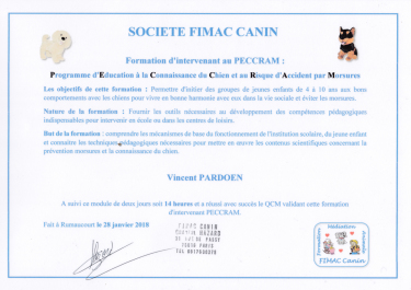 Intervenant certifié, j’ai suivi une formation pédagogique auprès de Chantal HAZARD, retraitée de l’Education Nationale, comportementaliste diplômée et intervenante en médiation animale, diplômée de l’Institut Français de Zoothérapie, qui depuis 40 ans met à profit son savoir et son expérience au profit de l’école et du chien.